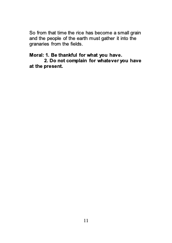 So from that time the rice has become a small grain and the people of the earth must gather it into the granaries from the fields. Moral: 1. Be thankful for what you have. 2. Do not complain for whatever you have at the present. 11