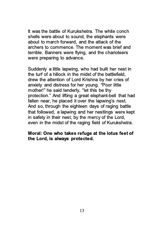 Suddenly a little lapwing, who had built her nest in the turf of a hillock in the midst of the battlefield, drew the attention of Lord Krishna by her cries of anxiety and distress for her young. “Poor little mother!” he said tenderly, “let this be thy protection.” And lifting a great elephant-bell that had fallen near, he placed it over the lapwing’s nest. And so, through the eighteen days of raging battle that followed, a lapwing and her nestlings were kept in safety in their nest, by the mercy of the Lord, even in the midst of the raging field of Kurukshetra.