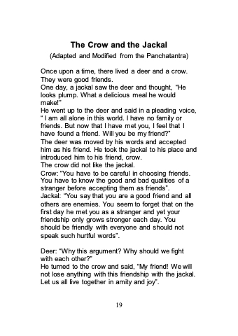 He turned to the crow and said, “My friend! We will not lose anything with this friendship with the jackal. Let us all live together in amity and joy”.