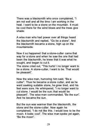 There was a blacksmith who once complained, “I am not well and all the time I am working in the heat. I want to be a stone on the mountain. It must be cool there for the wind blows and the trees give shade.