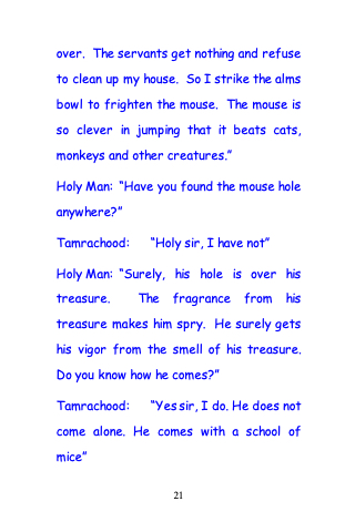 over. The servants get nothing and refuse to clean up my house. So I strike the alms bowl to frighten the mouse. The mouse is so clever in jumping that it beats cats, monkeys and other creatures.”