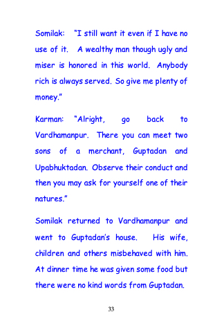 Somilak returned to Vardhamanpur and went to Guptadan’s house. His wife, children and others misbehaved with him. At dinner time he was given some food but there were no kind words from Guptadan.