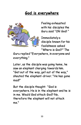 But the disciple thought: "God is everywhere. He is in the elephant and he is in me. Would God attack God? No, therefore the elephant will not attack me."