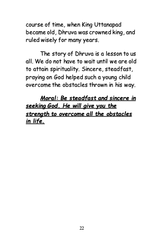 The story of Dhruva is a lesson to us all. We do not have to wait until we are old to attain spirituality. Sincere, steadfast, praying on God helped such a young child overcome the obstacles thrown in his way.