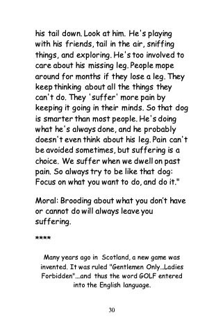 his tail down. Look at him. He's playing with his friends, tail in the air, sniffing things, and exploring. He's too involved to care about his missing leg. People mope around for months if they lose a leg. They keep thinking about all the things they can't do. They 'suffer' more pain by keeping it going in their minds. So that dog is smarter than most people. He's doing what he's always done, and he probably doesn't even think about his leg. Pain can't be avoided sometimes, but suffering is a choice. We suffer when we dwell on past pain. So always try to be like that dog: Focus on what you want to do, and do it."