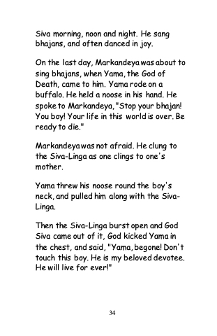 Markandeya was not afraid. He clung to the Siva-Linga as one clings to one's mother.