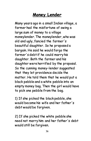Many years ago in a small Indian village, a farmer had the misfortune of owing a large sum of money to a village moneylender. The moneylender, who was old and ugly, fancied the farmer's beautiful daughter. So he proposed a bargain. He said he would forgo the farmer's debt if he could marry his daughter. Both the farmer and his daughter were horrified by the proposal. So the cunning money-lender suggested that they let providence decide the matter. He told them that he would put a black pebble and a white pebble into an empty money bag. Then the girl would have to pick one pebble from the bag.