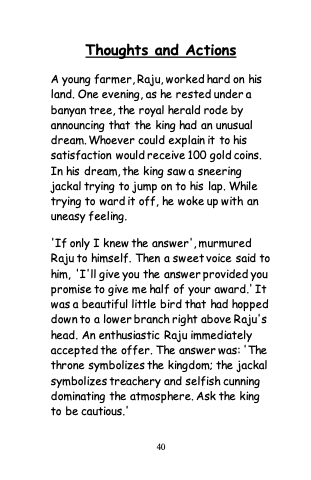 A young farmer, Raju, worked hard on his land. One evening, as he rested under a banyan tree, the royal herald rode by announcing that the king had an unusual dream. Whoever could explain it to his satisfaction would receive 100 gold coins. In his dream, the king saw a sneering jackal trying to jump on to his lap. While trying to ward it off, he woke up with an uneasy feeling.