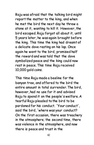 Raju was afraid that the talking bird might report the matter to the king, and when he met the bird the next day he threw a stone at it, wanting to kill it. However, the bird escaped. Raju forgot all about it, until 5 years later, he was again brought before the king. This time the king had dreamt of a delicate dove resting on his lap. Once again he went to the bird, promised half the reward and was told that the dove symbolized peace and the king could now rest in peace. This time Raju received 10,000 gold coins.