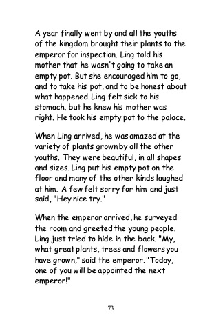 of the kingdom brought their plants to the emperor for inspection. Ling told his mother that he wasn't going to take an empty pot. But she encouraged him to go, and to take his pot, and to be honest about what happened. Ling felt sick to his stomach, but he knew his mother was right. He took his empty pot to the palace.