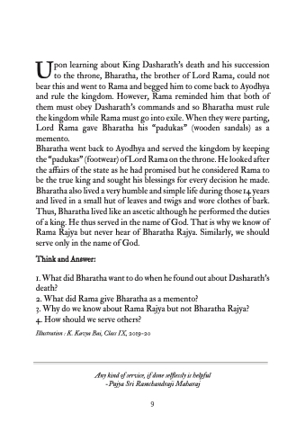 Bharatha went back to Ayodhya and served the kingdom by keeping the “padukas” (footwear) of Lord Rama on the throne. He looked after the affairs of the state as he had promised but he considered Rama to be the true king and sought his blessings for every decision he made. Bharatha also lived a very humble and simple life during those 14 years and lived in a small hut of leaves and twigs and wore clothes of bark. Thus, Bharatha lived like an ascetic although he performed the duties of a king. He thus served in the name of God. That is why we know of Rama Rajya but never hear of Bharatha Rajya. Similarly, we should serve only in the name of God.