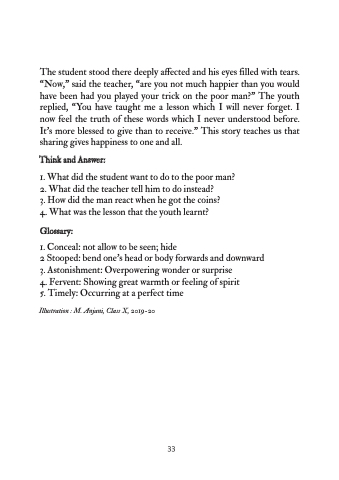 The student stood there deeply affected and his eyes filled with tears. “Now,” said the teacher, “are you not much happier than you would have been had you played your trick on the poor man?” The youth replied, “You have taught me a lesson which I will never forget. I now feel the truth of these words which I never understood before. It’s more blessed to give than to receive.” This story teaches us that sharing gives happiness to one and all.