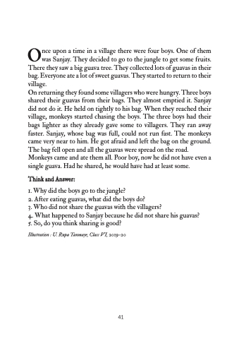 On returning they found some villagers who were hungry. Three boys shared their guavas from their bags. They almost emptied it. Sanjay did not do it. He held on tightly to his bag. When they reached their village, monkeys started chasing the boys. The three boys had their bags lighter as they already gave some to villagers. They ran away faster. Sanjay, whose bag was full, could not run fast. The monkeys came very near to him. He got afraid and left the bag on the ground. The bag fell open and all the guavas were spread on the road. Monkeys came and ate them all. Poor boy, now he did not have even a single guava. Had he shared, he would have had at least some.