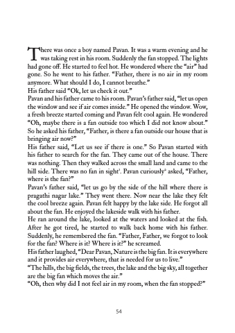 His father laughed, “Dear Pavan, Nature is the big fan. It is everywhere and it provides air everywhere, that is needed for us to live.”