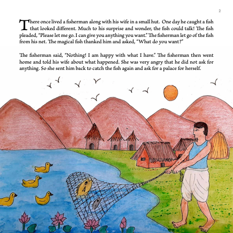 There once lived a fisherman along with his wife in a small hut. One day he caught a fish that looked different. Much to his surprise and wonder, the fish could talk! The fish pleaded, “Please let me go. I can give you anything you want.” The fisherman let go of the fish from his net. The magical fish thanked him and asked, “What do you want?”