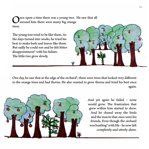 One day, he saw that at the edge of the orchard2, there were trees that looked very different to the orange trees and had thorns. He also wanted to grow thorns and tried his best once again.