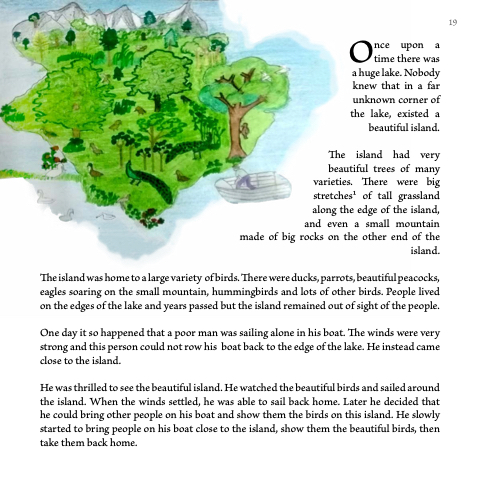 The island was home to a large variety of birds. There were ducks, parrots, beautiful peacocks, eagles soaring on the small mountain, hummingbirds and lots of other birds. People lived on the edges of the lake and years passed but the island remained out of sight of the people.
